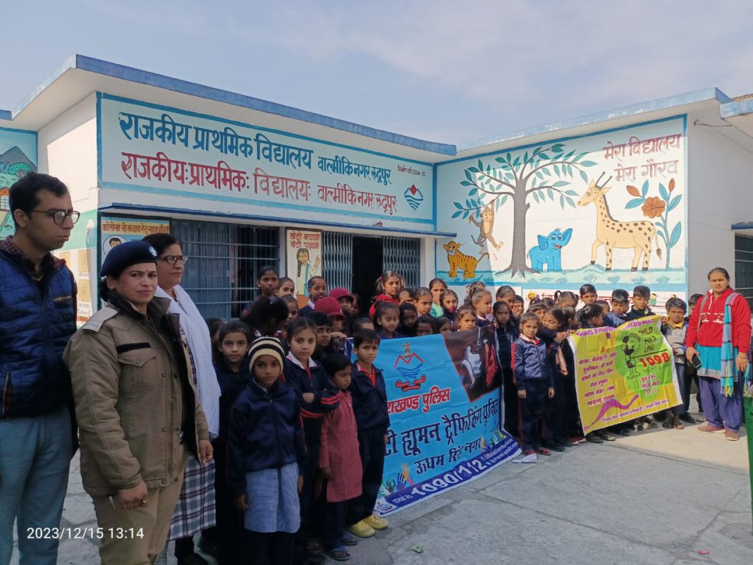रुद्रपुर :-  वरिष्ठ पुलिस अधीक्षक ऊधम सिंह नगर के आदेशानुसार आज दिनांक 15-12-2023 को एंटी ह्यूमन ट्रैफिकिंग यूनिट रुद्रपुर जनपद उधम सिंह नगर टीम द्वारा राजकीय प्राथमिक विद्यालय भूत बंगला रूद्रपुर उधम सिंह नगर में जाकर प्रधानाचार्य सुमन आर्य, अध्यापिका सीमा ग्रोवर, चाइल्ड हेल्पलाइन के सदस्य दीपा मेहरा केस वर्कर, अंशुल कपूर सुपरवाइजर की उपस्थिति में गोष्ठी का आयोजन किया गया। जिसमें स्कूली छात्र-छात्राओं को मानव तस्करी,बालश्रम, भिक्षावृत्ति,बाल विवाह, आदि से संबंधित जानकारी देकर जागरूक किया गया। व इसके अतिरिक्त महिलाओं से संबंधित होने वाले अपराध व उनसे बचने के संबंध में कानूनी जानकारी देकर जागरूक किया गया। व पुलिस सहायता हेतु टोल फ्री नंबर-112, चाइल्ड हेल्पलाइन नंबर-1098, साइबर हेल्पलाइन नंबर-1930 की भी जानकारी दी गई।