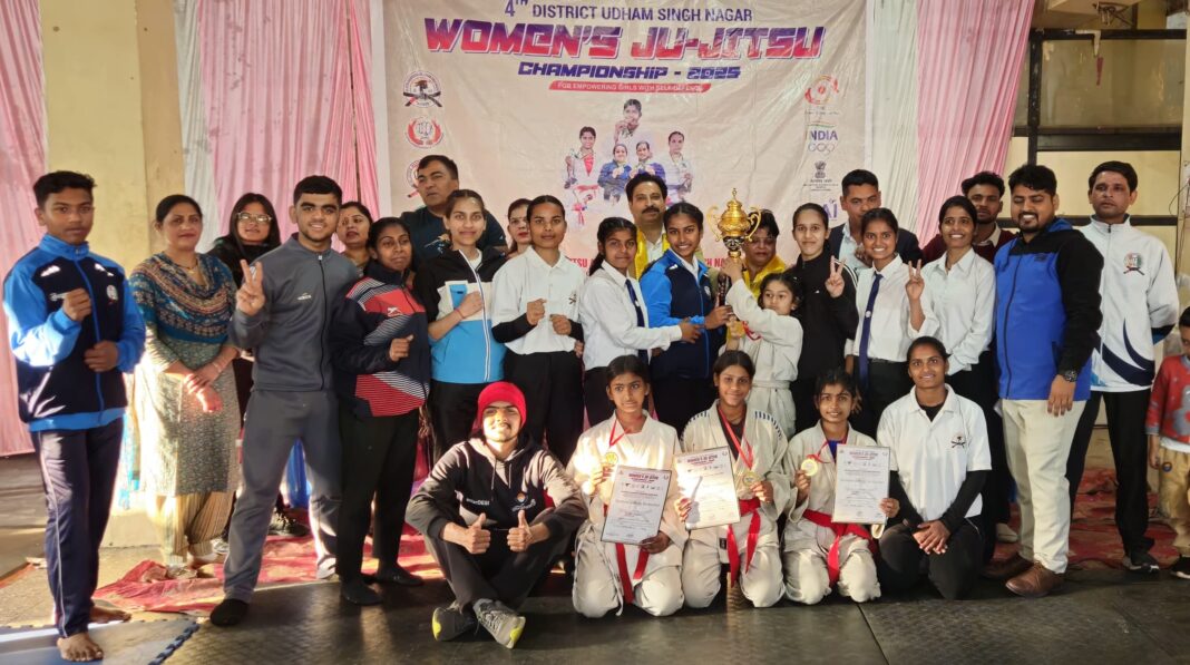 रुद्रपुर, उधम सिंह नगर :-  जिला जु–जित्सू एसोसिएशन ऑफ उधम सिंह नगर (रजि) के तत्वाधान में चतुर्थ निःशुल्क जिला स्तरीय महिला जु–जित्सू प्रतियोगिता 2025 का आयोजन श्री दुर्गा मंदिर धर्मशाला के हॉल में किया गया।