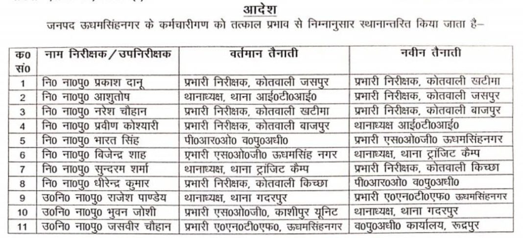 बीती देर रात वरिष्ठ पुलिस अधीक्षक उधमसिंहनगर डॉक्टर मंजुनाथ टी सी द्वारा कोतवाली/थाना प्रभारियों के किए गए स्थानांतरण।