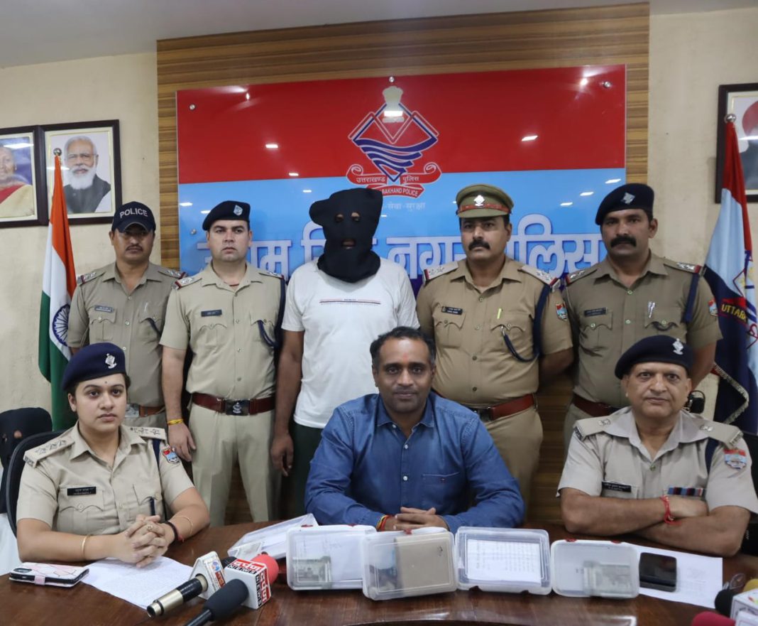 रुद्रपुर  :-  कोतवाली रुद्रपुर में वादी की लिखित तहरीर के आधार पर मुकदमा बनाम मो0 सलीम खान आदि पंजीकृत किया गया था। मुकदमा की विवेचना वरिष्ठ उप निरीक्षक  अर्जुन गिरी के सुपुर्द की गयी तथा मामले की गम्भीरता को देखते हुए वरिष्ठ पुलिस अधीक्षक उधम सिंह नगर के निर्देशों के अनुसार पुलिस अधीक्षक नगर रुद्रपुर व क्षेत्राधिकारी नगर रूद्रपुर के निकट पर्वेक्षण में प्रभारी निरीक्षक रुद्रपुर के नेतृत्व में शीघ्र मामले के खुलासे व अभियुक्त गणों की गिरफ्तारी हेतु पुलिस टीमें गठित की गयी थी। मामले के खुलासे हेतु गठित की गयी टीमों द्वारा 05 घण्टे के भीतर ही पतारसी सुरागरसी करते हुए अभि0 सलीम खान पुत्र गुलाम नवी नि0 गांधी कालोनी रुद्रपुर व अभि0 वरुण बाँध पुत्र मलुब सिंह बाँध नि० शेखपुरी थाना जानी मैरठ हाल भूतबंगला रुद्रपुर को गिरफ्तार किया गया तथा अभियुक्त गणो की निशादेही पर उनके द्वारा विकास प्राधिकरण के नाम से कूटरचित नोटिस जारी करने में उपयोग में लाये जा रहे दो मोहरे एवं 09 लिफाफे 12000रुपये तथा घटनामें प्रयुक्त किये 01 मो0सा0 व 01 व्हील चेयर तथा अभियुक्त गण दद्वारा जारी किया कूटरचित नोटिस ( अकबर टूल्स गांधी कालोनी के नाम पर जारी किया गया ) जिला विकास प्राधिकरण रुद्रपुर का नोटिस बरामद किया गया । दोनो ही अभि0 गण शातिरह किस्म के अपराधी है इस प्रकार के अपराधओ को दोनो ही मिलकर पत्रकारिता की आड़ में मो0 सा0 में पुलिस का लोगो व पुलिस लिखवाकर व भोले भाले लोगो को प्राधिकरण के नोटिस भेजकर अवैध वसूली करते है।