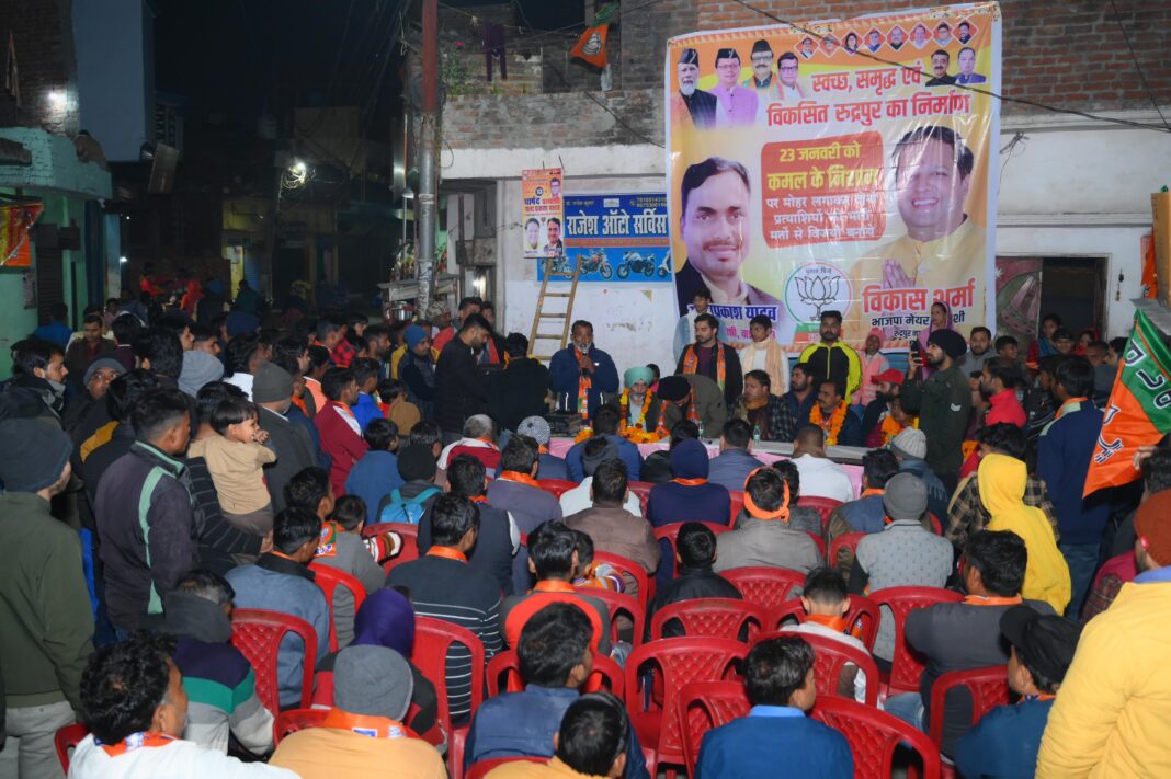 रुद्रपुर :- नगर निगम वार्ड नंबर 12 से पार्षद प्रत्याशी एस पी यादव जी एवं वार्ड नंबर 13 से पार्षद प्रत्याशी महेंद्री शर्मा द्वारा रेशमबाड़ी होली चौक पर आयोजित भव्य नुक्कड़ सभा कार्यक्रम में जाकर समस्त एवं स्थानीय लोगों को संबोधित कर आगामी नगर निकाय चुनाव में भाजपा के पक्ष में अधिक से अधिक मतदान करने हेतु अपील की ।।इस दौरान भाजपा युवा नेता हिमांशु शुक्ला जी भुवन गुप्ता जी रोशन लाल ठेकेदार जी नत्थू लाल जी पप्पू श्रीवास्तव प्रेमपाल गंगवार रामदास गुरुजी रवि शर्मा गुड्डू शर्मा रजत सिंह विनोद शर्मा महेश शर्मा सुरेश शर्मा पप्पू शर्मा राधे-राजा नरेश उमेश महेश गंगवार लखन ईश्वरी प्रसाद दीपचंद कश्यप रघुवीर राकेश कश्यप नरेंद्र सिंह अमित सिंह अंकित श्रीवास्तव सुनील सिंह शर्मा गौरव शर्मा कमलेश जितेंद्र शर्मा राकेश सिंह भवन गुप्ता राजू राठौड़ कन्हैया राठौर तोताराम राठौर राजपाल सौरभ सिंह गोपाल सिंह आदि उपस्थित रहे।