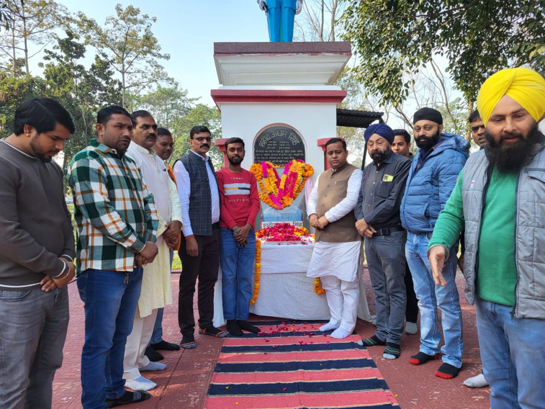 रूद्रपुर :- शहीद ऊधम सिंह की जयंती पर आज भाजपा आर्थिक प्रकोष्ठ के प्रदेश सह संयोजक भारत भूषण चुघ ने साथियों के साथ कलेक्ट्रेट स्थित शहीद ऊधम सिंह की प्रतिमा पर माल्यार्पण कर उन्हें श्रद्धांजलि देते हुए नमन किया। उन्होंने कहा कि शहीद ऊधम सिंह ने देश के आंदोलन में क्रांतिकारी भूमिका निभाई थी। देश की आजादी में उनका योगदान कभी नहीं भुलाया जा सकता है। उन्होंने कहा कि जलियावाला में आंदोलनकारियों पर फायरिंग करने का आदेश देने वाले अंग्रेजी हकूमत के जनरल डायर को उधम सिंह ने लंदन में भर अदालत में गोलियों से छलनी कर दिया था। श्री चुघ ने कहा की प्रधानमंत्री नरेन्द्र मोदी ने आज का दिन चार साहबजादों की कुर्बानी की स्मृति में वीर बालक दिवस मनाने की घोषणा की है। जिसे देखते हुए चुघ की अगुवाई में सभी ने वीर बालकों के बलिदान को नमन किया। इस दौरान उनके साथ बलजीत सिंह गाबा, नरेंद्र सिंह, राजेंद्र सिंह नारंग, जगजीत सिंह गोल्डी, वीएस गंगवार, डॉ प्रशांत सिंह, अजीत पाल सिंह, हरविंदर सिंह जॉनी, संजय आर्य, शिवकुमार शिब्बू, सन्नी पासवान, अभिषेक कुमार, सूरज कुमार आदि उपस्थित थे।