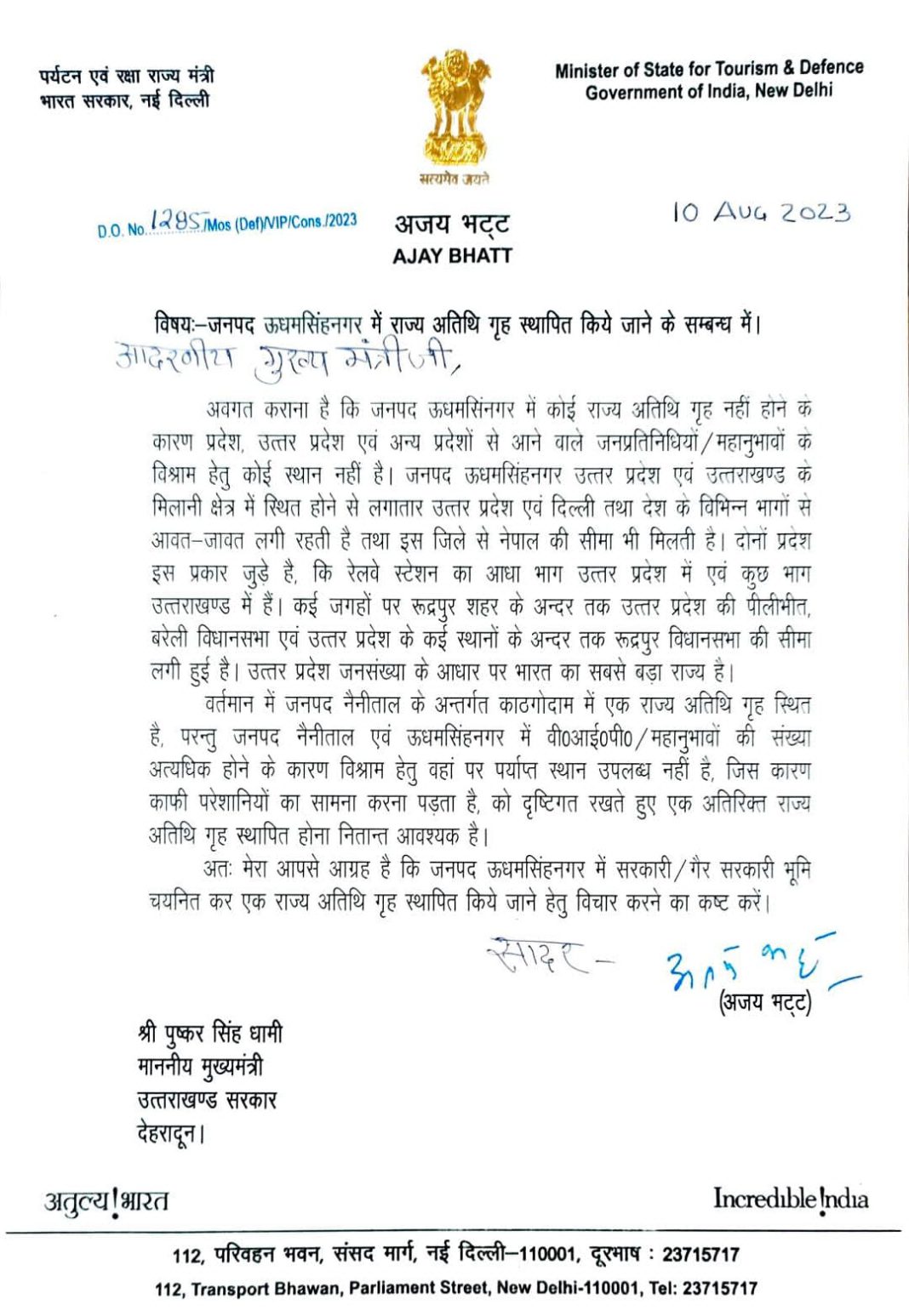 सबसे बड़ा राज्य है, वर्तमान में जनपद नैनीताल के अंतर्गत काठगोदाम में एक राज्य अतिथि गृह है परंतु उधम सिंह नगर में कोई भी अतिथि ग्रह नहीं होने के कारण बहुत परेशानियों का सामना करना पड़ता है इन्ही परेशानियों को देखते हुए माननीय सांसद अजय भट्ट जी द्वारा मुख्यमंत्री जी आप इस सम्बन्ध मे एक पत्र दिनांक 10 अगस्त 2023 को प्रेषित किया गया था जिसकी स्वीकृति मिल चुकी है।खबर व विज्ञापन के लिए संपर्क करें