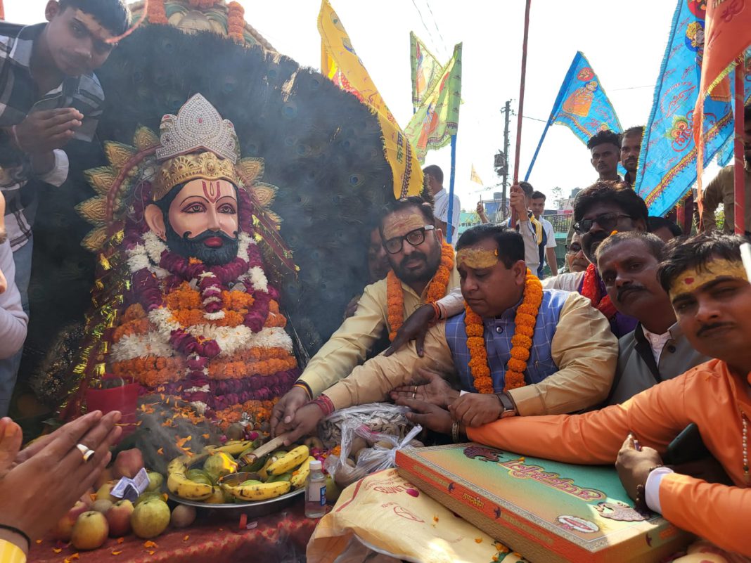 रूद्रपुर। श्री श्याम बाबा खाटू के जन्मोत्सव पर श्री खाटू श्याम सेवा समिति शिवनगर द्वारा आज ट्रांजिट कैंप से गल्ला मंडी तक भव्य निशान यात्रा निकाली गई। जिसमे सैकड़ों बाबा भक्तों ने बाबा जी की भक्ति में मस्त होकर निशान के साथ प्रतिभाग किया। निशान यात्रा धार्मिक अनुष्ठानों के साथ ट्रांजिट कैंप थाना के सामने श्री राधा कृष्ण मंदिर से प्रारंभ हुई। श्री खाटू श्याम बाबा के शीश स्वरूप को बाबा भक्तों ने सुसज्जित वाहन पर भव्य रूप से सजाकर विराजमान किया था। समाजसेवी भारत भूषण चुघ वा संजय ठुकराल ने पूजा अर्चना कर दीप प्रज्ज्वलित किया और खाटू श्याम बाबा का आर्शीवाद लिया। जिसके साथ साथ कई जनप्रतिनिधि, विभिन्न राजनैतिक, धार्मिक, सामाजिक, व्यापारिक संगठनों के पदाधिकारी व सदस्य तथा सैकड़ों की संख्या में महिला, पुरुष, युवा, बच्चे भजन कीर्तन के साथ श्री खाटू श्याम बाबा जी जयघोष करते जा रहे थे। निशान यात्रा राधा कृष्ण मंदिर से प्रारंभ होकर ट्रांजिट कैंप मुख्य मार्ग, झील मोड़, डीडी चौक, अग्रसेन चौक, गांधी पार्क, महाराजा रणजीत सिंह पार्क, मुख्य बाजार, भगत सिंह चौक होते हुए गल्ला मंडी स्थित श्री खाटू श्याम मंदिर पहुंची। जहां बाबा भक्तों ने निशान यात्रा का जोरदार स्वागत किया। मंदिर में बाबा भक्तों ने केक काटकट श्री खाटू श्याम बाबा जी का जन्मोत्सव जयघोषों के साथ धूमधाम से मनाया। बैंड बाजे तथा डीजे के मधुर धार्मिक संगीत के साथ निशान यात्रा श्री खाटू श्याम मंदिर से रवाना होकर ट्रांजिट कैंप चामुण्डा मंदिर शिवनगर लौटी। जहां निशान यात्रा में शामिल बाबा भक्तों को भंडारा वितरित किया गया। मार्ग में अनेक स्थानों पर बाबा भक्तों द्वारा निशान यात्रा का पुष्प वर्षा के साथ स्वागत किया गया। आयोजन समिति के संयोजक संजीव गुप्ता वा वरिष्ठ समाजसेवी भारत भूषण चुघ ने निशान यात्रा में शामिल होने वालों के साथ ही निशान यात्रा को सफल बनाने में सहयोग करने वाले सभी महानुभावों का आभार व्यक्त किया। ट्रांजिट कैंप थाना पुलिस ने श्री खाटू श्याम बाबा का आर्शीवाद लेकर मुख्य मार्ग पर यातायात व्यवस्था को दुरुस्त बनाए रखने में सहयोग किया। श्री गुप्ता ने बताया कि आज सायं सात बजे से श्री श्याम सेवा समिति, प्रीत विहार द्वारा प्रीत विहार वार्ड 25 में श्री शनि मंदिर के समीप ग्रेटर कैलाश कालोनी में श्री खाटू श्याम बाबा जी का भव्य संकीर्तन दरबार सजाया जाएगा। जिसमे आमंत्रित भजन गायक कलाकार बाबा की महिमा का गुणगान करेंगे। निशान यात्रा में संजीव गुप्ता, भारत भूषण चुघ, संजय ठुकराल,सुरेंद्र गुप्ता, विकास बंसल,राज कोली शिवकुमार शिव्वु प्रेमपाल गंगवार, कृष्ण पाल गंगवार, वेद प्रकाश मौर्या, रविन्द्र सिंह, हरिओम, मनोज गुप्ता, राजी