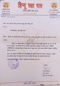 22 जनवरी 2024 को श्री राम प्राण प्रतिष्ठा के अवसर रुद्रपुर क्षेत्र में मांस मदिरा की दुकान बंद रखने के संबंध में हिंदू रक्षा दल के द्वारा जिलाधिकारी को सौंपा गया ज्ञापन