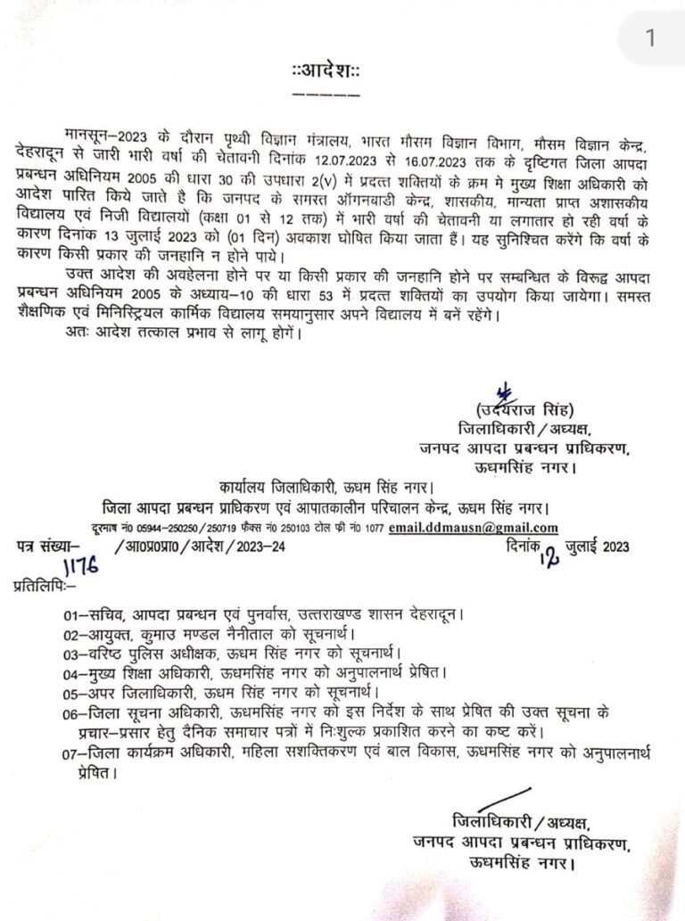 रुद्रपुर। जिलाधिकारी उदय राज सिंह ने 14 व 15 जुलाई को इंटर तक निजी व सरकारी सभी विद्यालय बंद रखने...