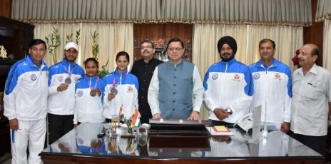 मुख्यमंत्री ने किया 36 वें नेशनल गेम्स के मेडल विजेता एथलेटिक्स को सम्मानित। मुख्यमंत्री श्री पुष्कर सिंह धामी से बुधवार को मुख्यमंत्री आवास स्थित कैम्प कार्यालय में गुजरात में आयोजित 36वें नेशनल गेम्स के एथलेटिक्स प्रतिस्पर्धा में मेडल प्राप्त करने वाले एथलेटिक्स एवं उनके प्रशिक्षकों को सम्मानित किया। मुख्यमंत्री ने कहा कि गुजरात में आयोजित हुए 36 वें नेशनल गेम्स में राज्य के सभी खिलाड़ियों ने अपना उत्कृष्ट प्रदर्शन कर प्रदेश का मान बढ़ाया है। उन्होंने पदक विजेता खिलाड़ियों के उज्ज्वल भविष्य की कामना की। मुख्यमंत्री ने कहा कि प्रदेश में खेलों को बढ़ावा देने के लिये खेलों एवं खिलाड़ियों के व्यापक हित में नई खेल नीति के साथ ही अनेक कल्याणकारी कदम उठाये गये हैं। इस अवसर पर उत्तराखंड एथलेटिक्स के अध्यक्ष व उत्तरांचल ओलंपिक एसोसिएशन के वरिष्ठ उपाध्यक्ष श्री संदीप शर्मा, उत्तराखंड एथलेटिक्स के सचिव, श्री के.जे.एस.कलसी, कोषाध्यक्ष श्री एम सी शाह, श्री सूरज सिंह पंवार सिल्वर मेडलिस्ट, कुमारी मानसी नेगी सिल्वर मेडलिस्ट, कुमारी रेशमा पटेल ब्रोंज मेडलिस्ट तथा उनके प्रशिक्षक श्री अनूप बिष्ट देवभूमि द्रोणाचार्य अवार्डी तथा श्री लोकेश कुमार एथलेटिक्स कोच, स्पोट्र्स कॉलेज उपस्थित थे।