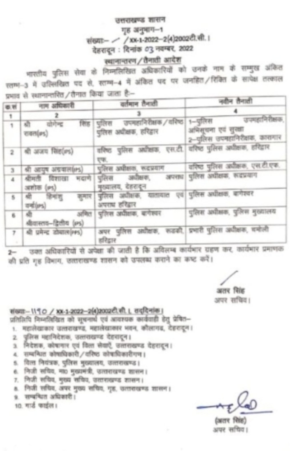 एसटीएफ के एसएसपी अजय सिंह को एसएसपी हरिद्वार नियुक्त किया गया है। प्रमेंद्र डोबाल को एसएसपी चमोली, हिमांशु वर्मा को बागेश्वर का पुलिस कप्तान बनाया गया है। विशाखा को रुद्रप्रयाग की कप्तान की जिम्मेदारी दी गई है और अमित श्रीवास्तव बागेश्वर से पुलिस मुख्यालय से संबद्ध किए गए हैं। आयुष अग्रवाल को रुद्रप्रयाग से एसटीएफ की कमान सौंपी गई है।
