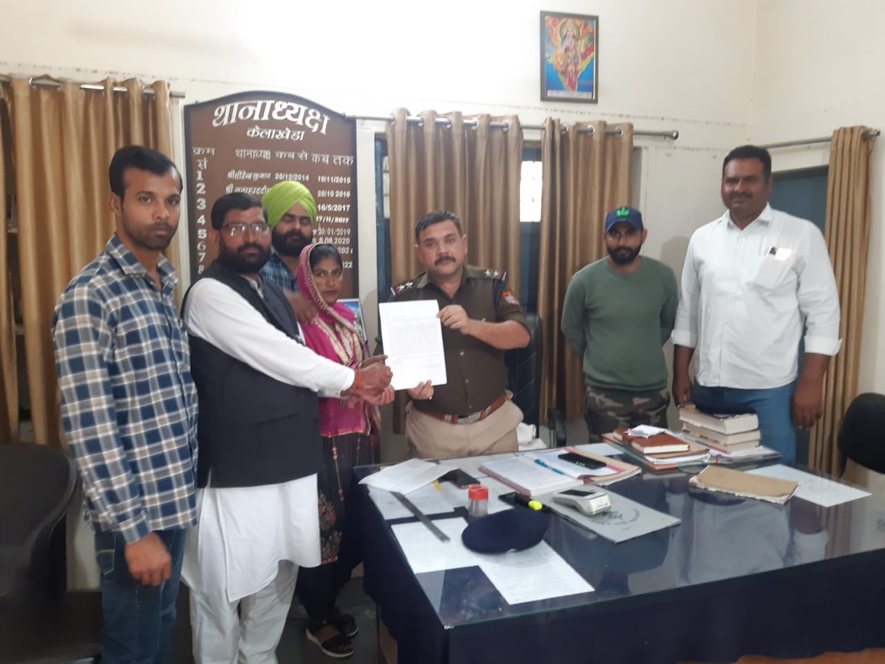 केलाखेडा। ग्राम रम्पुराकाजी ग्राम प्रधान व उनके पति को जल निगम ठेकेदार के पुत्र द्वारा जान से मारने की धमकी देन पर ग्राम प्रधान संध ने ज्ञापन थाना केलाखेडा में देकर अरोपियो के विरूद्व कार्यवाही की मांग की।