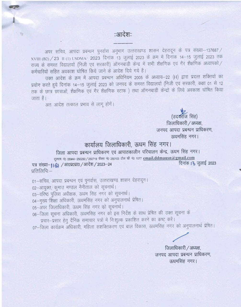 जिलाधिकारी उदय राज ने जारी आदेश में कहा कि आपदा और भारी से भारी बारिश की मौसम विभाग की चेतावनी के मद्देनजर पूरे राज्य में स्कूल बंद हैं। इसी क्रम में ऊधमसिंह नगर जिले में भी आंगनबाड़ी केंद्र, कक्षा 12 तक के निजी व सरकारी स्कूलों में अवकाश घोषित किया गया है। इस दौरान शैक्षणिक और गैर शैक्षणिक स्टाफ को भी स्कूल नहीं बुलाया जा सकेगा।